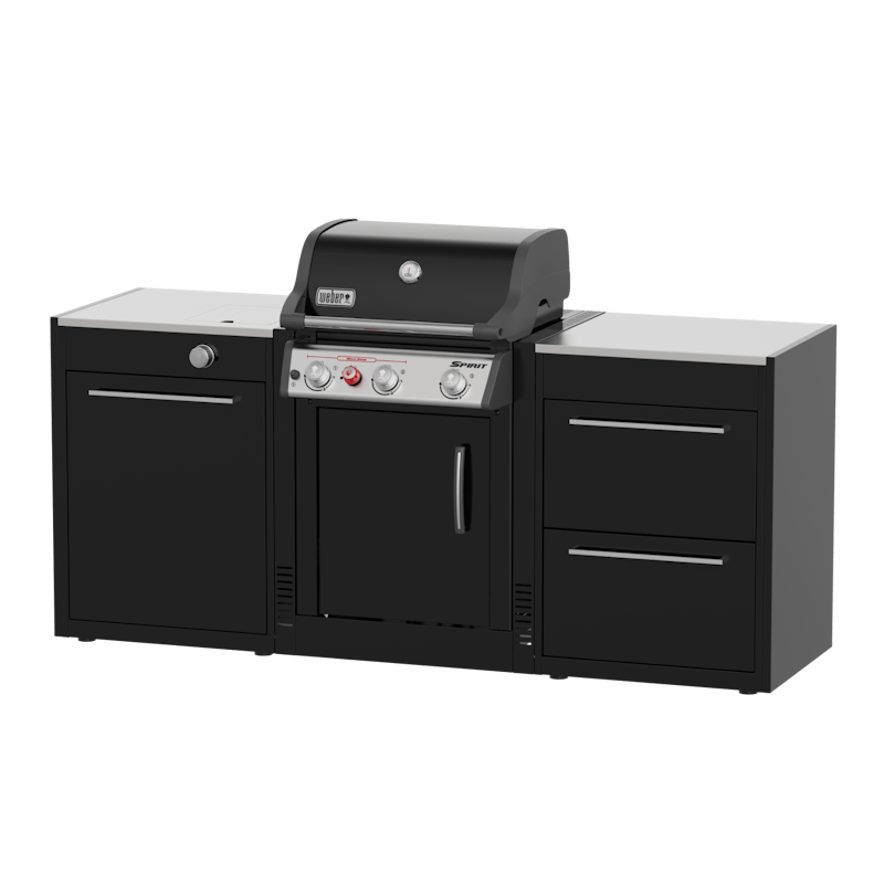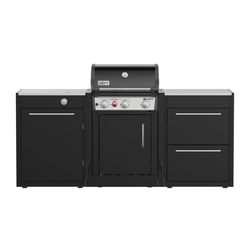 Alt kısmında gaz tüpü veya ızgara aksesuarları için ölçülü depolama alanı bulunan yan brülör modülü ve her şeyi elinizin altında tutmak için 65 kg’a kadar aksesuar alabilen çekmeceli bir modülden oluşan Açık Hava Barbekü Mutfağı. Genesis ızgara dahil değildir.