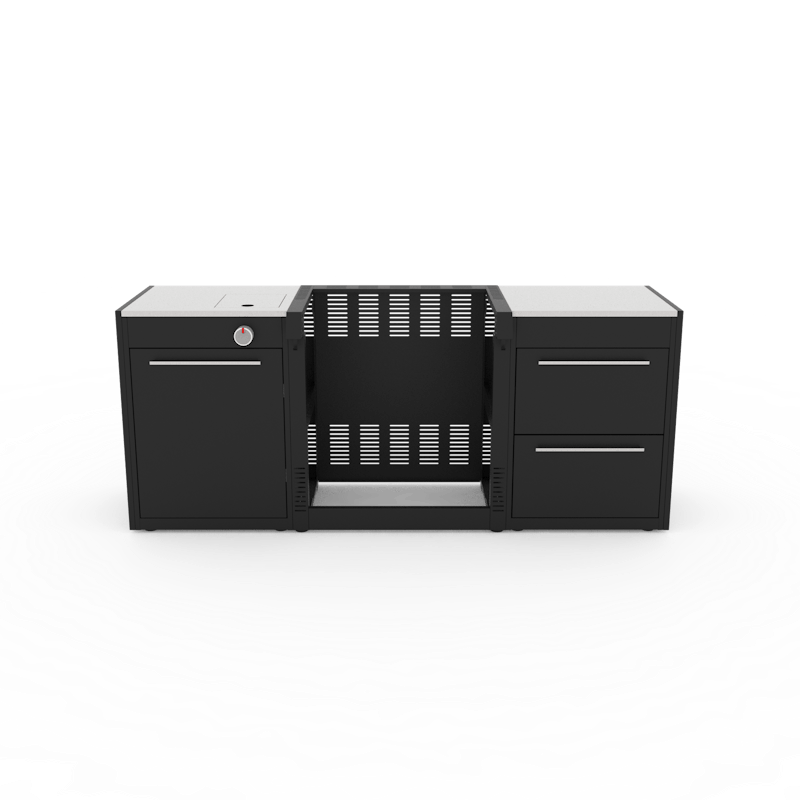 - Çekmece başına 65 kg yük kapasitesine sahip bu modül, ağır döküm demir veya erişilebilir olması gereken diğer barbekü aksesuarları için alan sunar. Ayrıca ızgara ve pişirme için küçük mutfak eşyaları da açık hava mutfağında saklanabilir. Tezgah yüksekliği: 920 ila 950 mm – ayarlanabilir Boyutlar: 640 (G) x 611 (D) mm